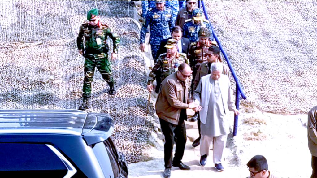বাংলাদেশ সেনাবাহিনীর শীতকালীন ম্যানুভার অনুশীলন প্রত্যক্ষ করতে রাজবাড়ী পৌঁছেছেন অন্তর্বর্তীকালীন সরকারের প্রধান উপদেষ্টা ড. মুহাম্মদ ইউনূস।